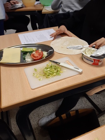 De laatste les hebben ze zelf een gezonde lunch gemaakt: een wrap met kaas, gerookte zalm en verse groentjes. Voor ze aan de slag gingen, hebben we samen extra aandacht besteed aan de veiligheidsvoorschriften: haarnetje aandoen, werkblad ontsmetten, handen correct wassen, werkmateriaal afwassen, groenten wassen en niets doorgeven aan elkaar.