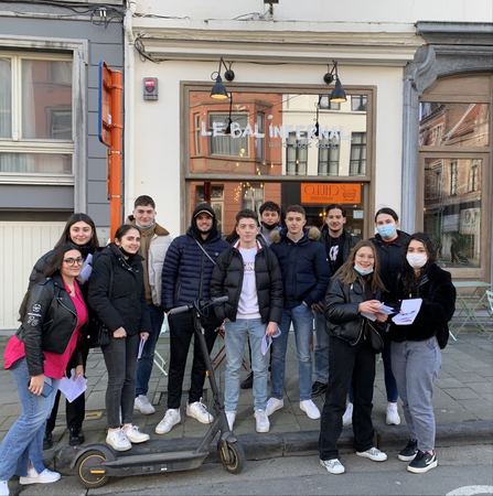 Geen betere plek om het lezen aan te moedigen dan een bezoek aan de bib. 5EMT en 6EMT gingen op vrijdag 11 februari naar De Krook. De hoofdbibliotheek van Gent bevond zich niet altijd op die plek: dit is immers de vierde vestigingsplaats. Ideaal dus om de leerlingen kennis te maten maken met de drie voorgaande vestigingsplaatsen (Ottogracht, Kouter, Woodrow Wilsonplein). Maar ook tussen deze plekken door viel op literair vlak heel wat interessants te vertellen. Elk van de twaalf leerlingen zocht dan ook info op over een telkens andere markante literaire hotspot en presenteerde die info tijdens de wandeling aan hun medeleerlingen en de twee begeleidende leraren. Ze deden dat uitstekend. Tussendoor kruisten ze in een bijbehorende opdrachtenbundel de juiste antwoorden aan op een hele reeks vragen.