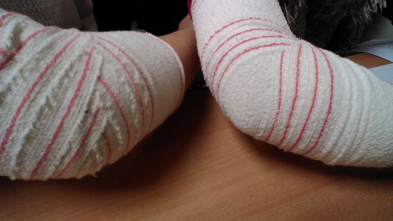 De leerlingen van de 7e specialisatiejaren oefenden diverse verbandtechnieken in als voorbereiding op hun eindproef eerste hulp. Binnen de lessen PAV (Project Algemene Vakken) volgen de leerlingen een basisopleiding eerste hulp van het Rode Kruis. Oefening baart kunst!