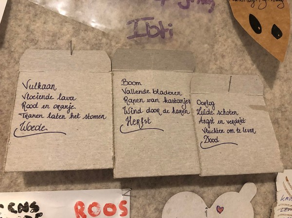 Externe begeleider Tijs liet hen via associaties zelf zinnen bedenken die ze dan ritmisch of volgens een bepaald gevoel moesten uitspreken. Vervolgens mochten ze hun appreciatie uitdrukken over een reeks aangeboden haiku’s of elfjes. De stap naar het zelf schrijven van deze poëzievormen werd daardoor plots een stuk kleiner. De leerlingen noteerden hun creatieve schrijfproducten op gerecycleerd papier of op afvalmateriaal. Een logische keuze omdat het thema van deze workshop ‘natuur’ was. Alle haiku’s en elfjes hangen te kijk en te keur in het Leessalon.