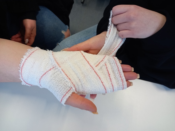 De leerlingen van het specialisatiejaar Kantoor, Logistiek en Winkelbeheer en etalage volgen momenteel een basisopleiding eerste hulp. De stappen in de eerste hulp, basisprincipes eerste hulp, reanimeren, defibrilleren en huidwonden zijn maar enkele onderwerpen uit deze opleiding. Momenteel oefenen ze volop de verschillende verbandtechnieken in. Zo bereiden ze zich voor op hun praktijkexamen.
